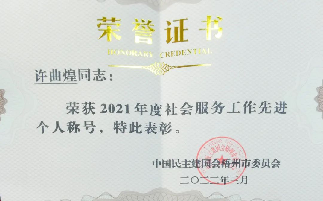 會議學習了全國兩會精神,選舉產生了民建廣西區第十次代表大會代表,表彰了2021年度先進基層組織、先進個人和優秀會員,百裕集團董事長許曲煌榮獲"2021年度社會服務工作先進個人"稱號。