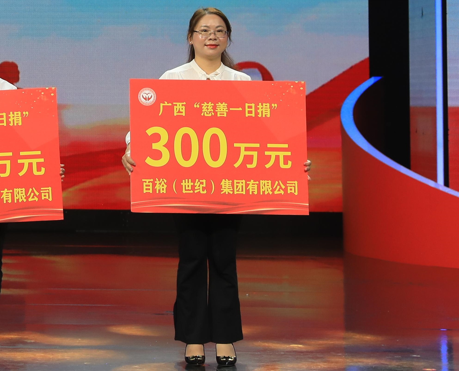 百裕世紀(集團)有限公司市場總監曾凱蘭代表百裕集團向廣西慈善總會舉牌捐款300萬元,以實際行動弘揚中華民族傳統美德,弘揚大愛無疆的奉獻精神,詮釋新時代民營企業的使命擔當,為慈善事業貢獻自己的力量。