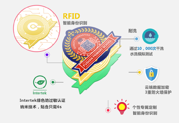 這兩塊標(biāo)識(shí)分別是RFID智能傳感芯片和智能二維碼校徽,它們有效提升了校服的科技感。