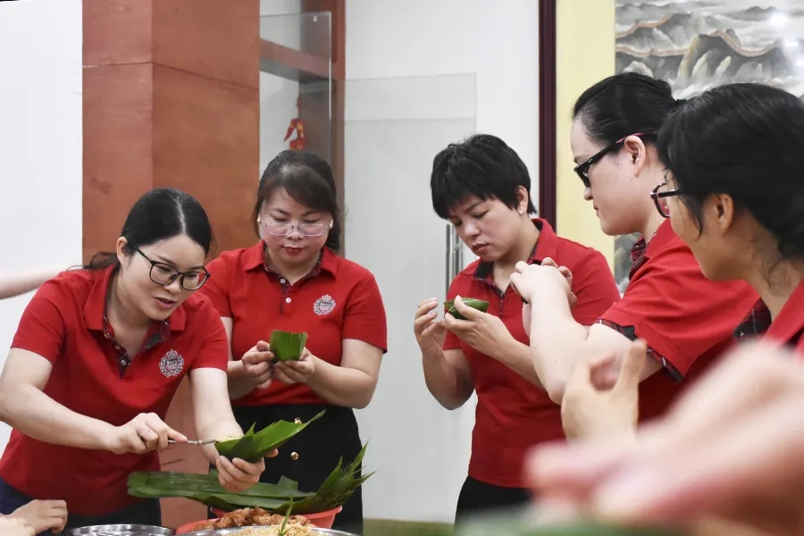 后勤部精心為大家準備了豐富的食材五花肉、雞蛋、香菇、魷魚、海蠣、綠豆,并根據員工喜好調配好兩種不同口味餡料。